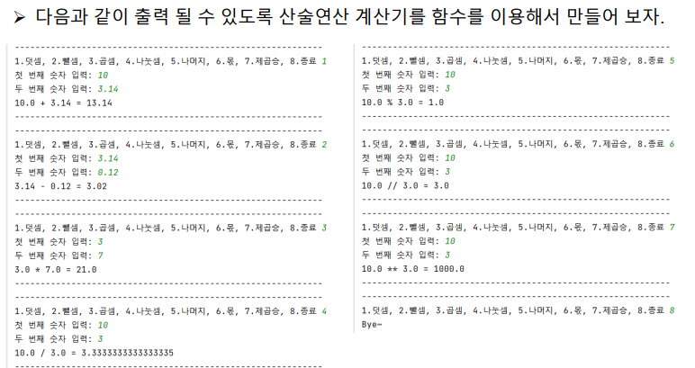 selectNum = int(input('1.덧셈, 2.뺄셈, 3.곱셈, 4.나눗셈, 5.나머지, 6.몫, 7.제곱승, 8.종료 '))
