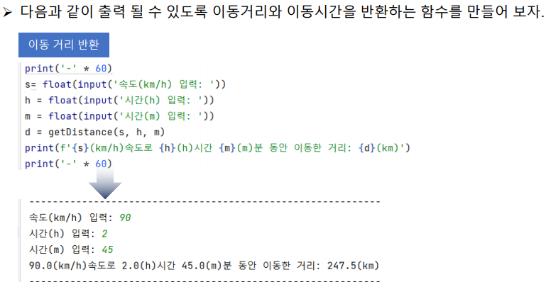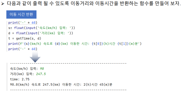 print(f'{s}(km/h) 속도로 {d}(km) 이동한 시간: {t[0]}(h)시간 {t[1]}(m)분')