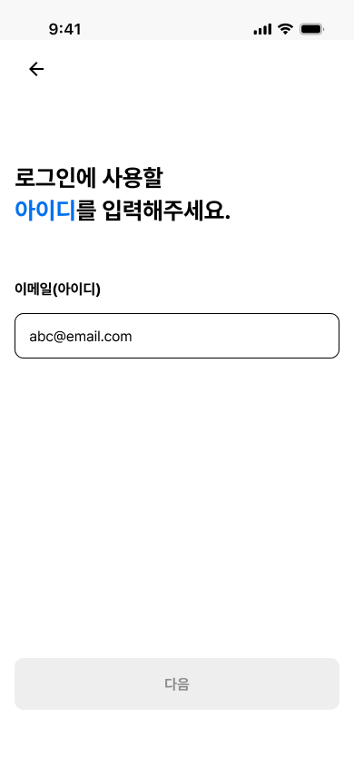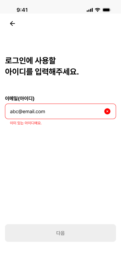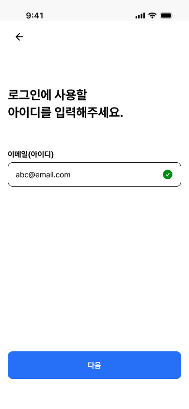 초기 화면에는 이메일을 입력받을 수 있으며, 이메일 형식이 올바르다면 버튼이 활성화됩니다. 만약 어떠한 에러가 발생한다면 Validation 메시지가 보이며 버튼이 활성화되지 않습니다.