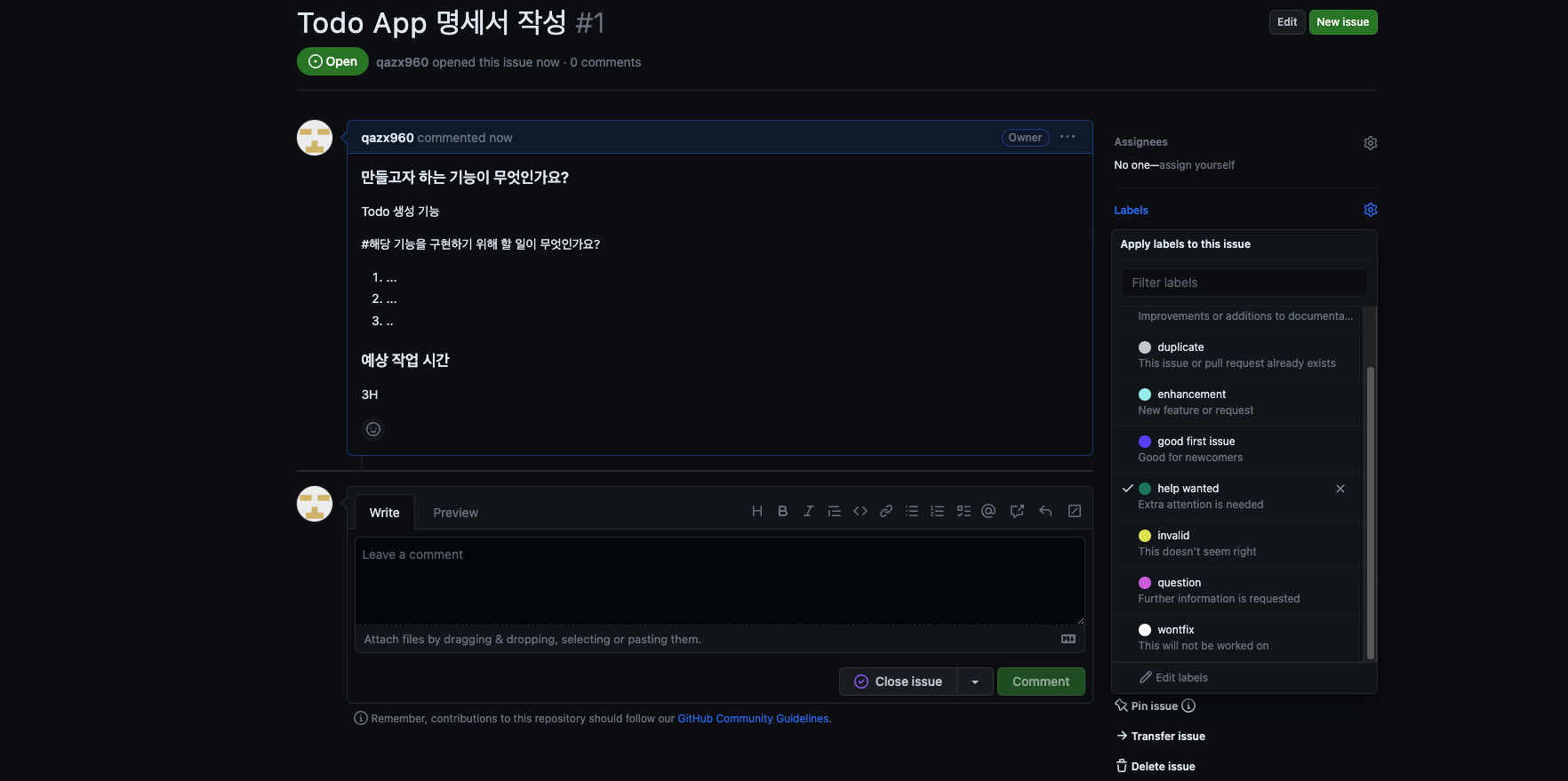 다른 팀원들도 보는 이슈이기 때문에 제목은 신경써서 작성하는 것이 좋다. 그리고 세부사항은 이슈에 대한 정보를 추가해주면 된다. 추가적으로 예상완료 시간까지 작성해주면 좋다.