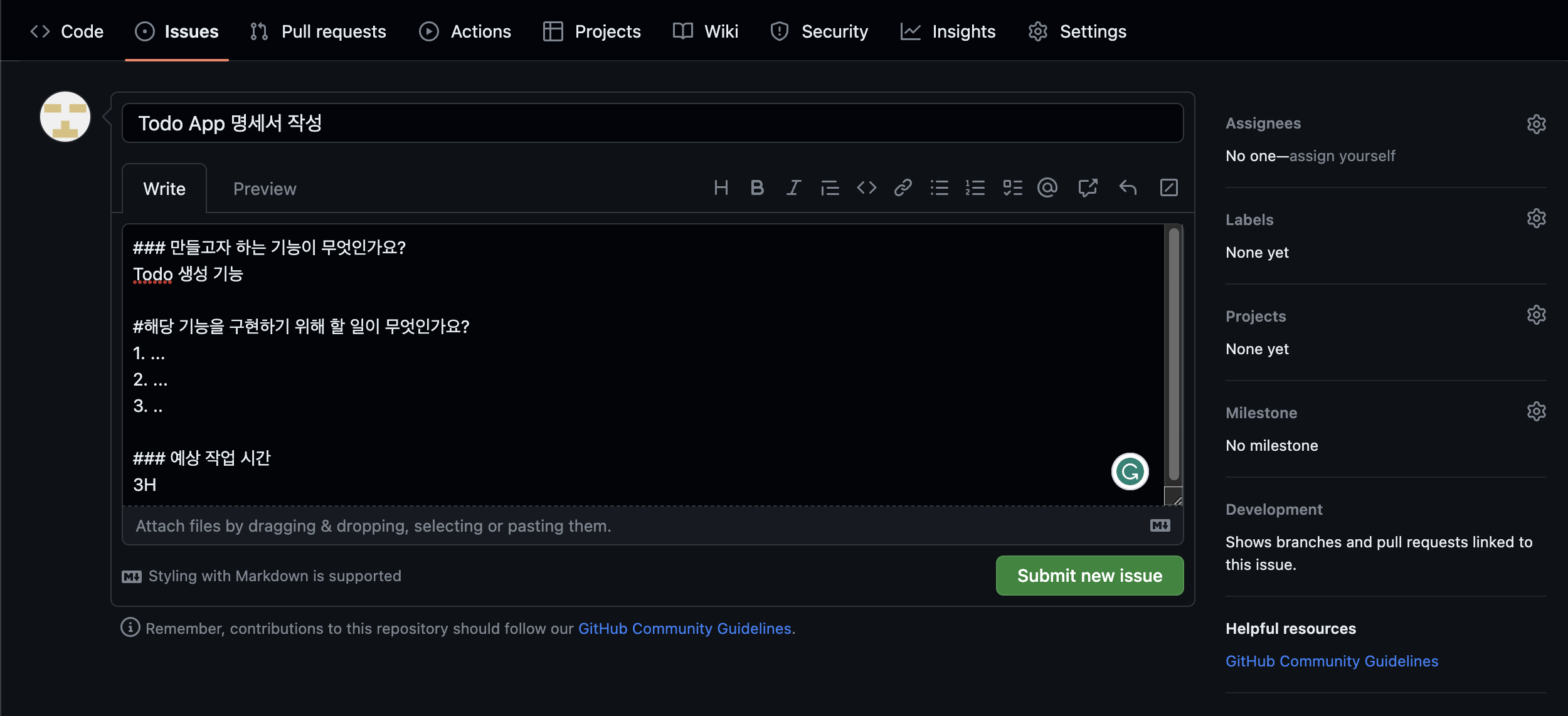 설정이 완료됐으면 Submit New issue 누르면 된다. 나중에 들어가서 또 수정할 수 있으니, 변경사항 있어도 걱정 안해도 된다.