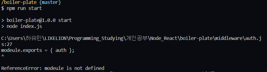 오류가 콘솔창에 떠서 순식간에 고치고 넘어갔다. module.exports 인데 modeule 이라고 썼다.