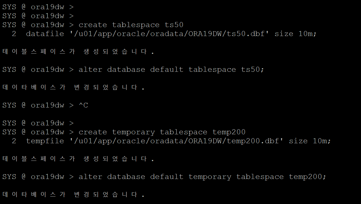 SYS @ ora19dw > alter database default temporary tablespace temp200;