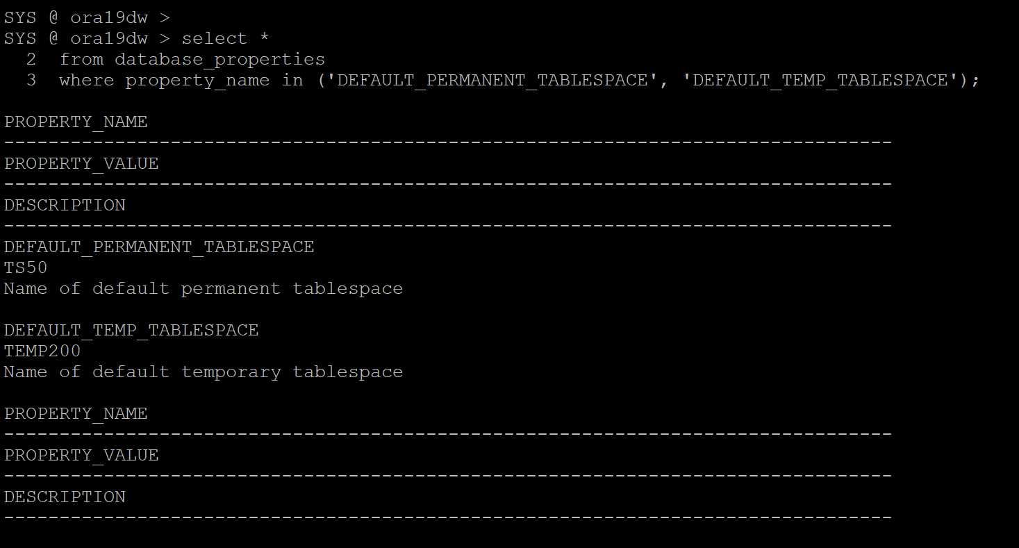 3 where property_name in ('DEFAULT_PERMANENT_TABLESPACE', 'DEFAULT_TEMP_TABLESPACE');