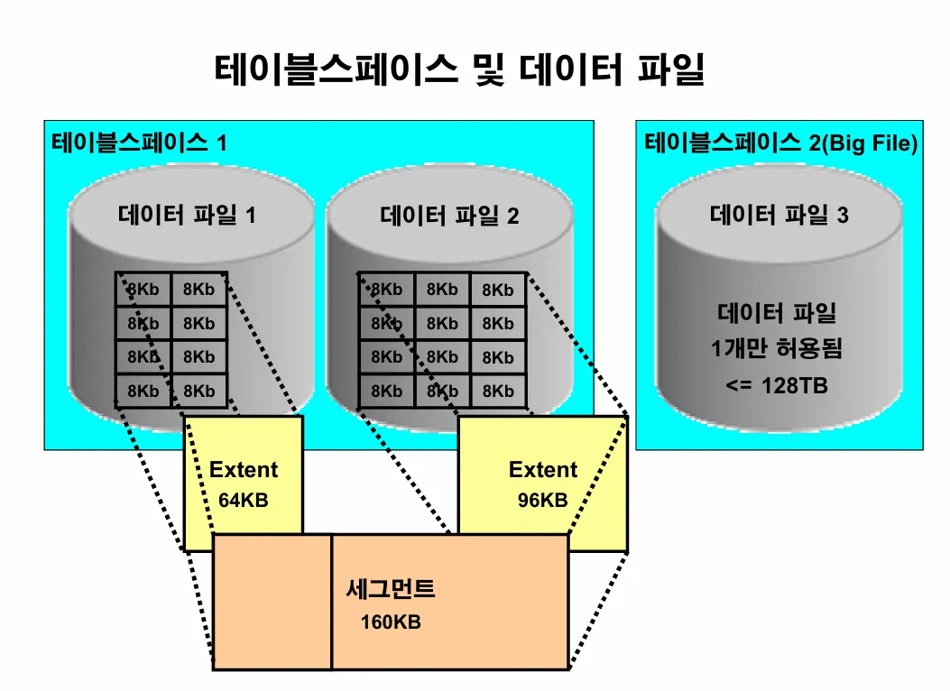 bigfile tablespace: 하나의 테이블 스페이스에 하나의 데이터 파일만 저장할 수 있고, 그 하나의 파일의 크기가 128 테라바이트까지 생성할 수 있음