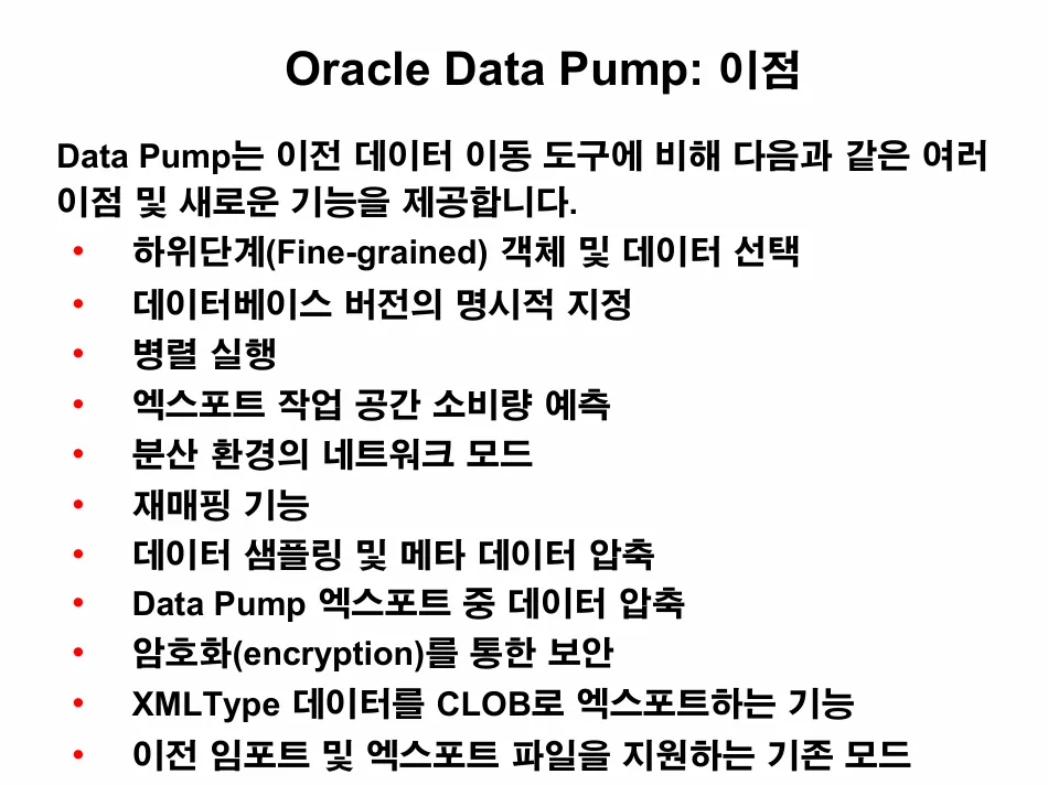 - export / import dump, export / import pump ( 가장 중요한 기본기술 )