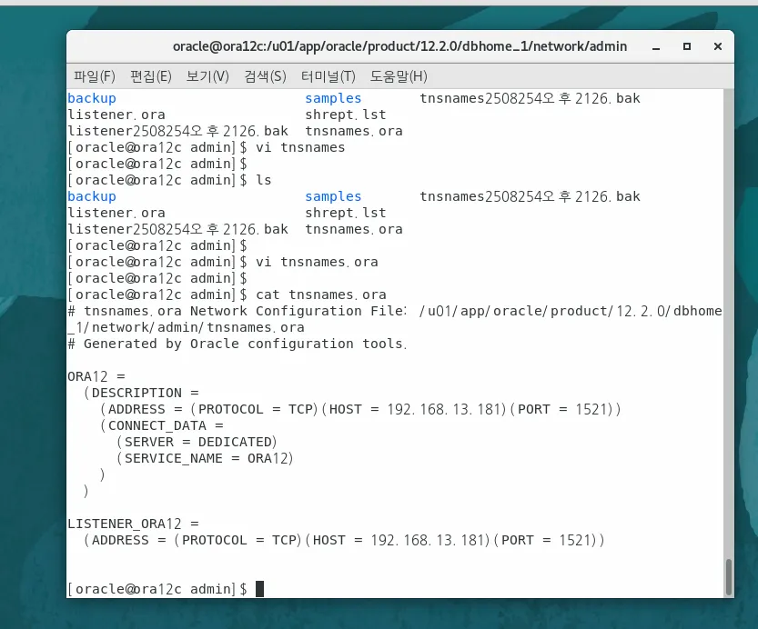 /u01/app/oracle/diag/tnslsnr/ora12c/listener/alert/log.xml (으)로 로그 메시지를 기록했습니다