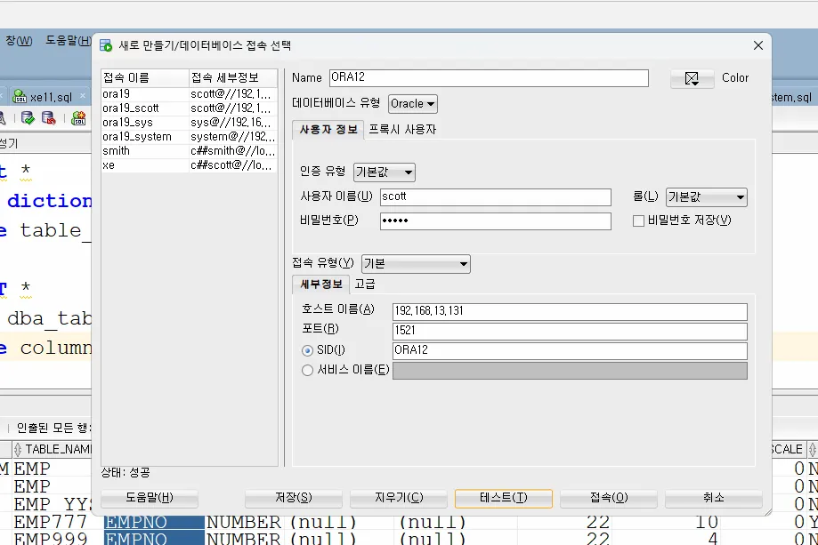 (DESCRIPTION=(ADDRESS=(PROTOCOL=TCP)(HOST=192.168.13.131)(PORT=1521)))에 연결되 었습니다