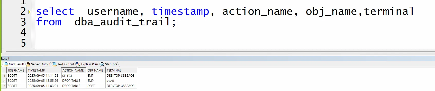 [실습1] sys 유져에서 scott 의 emp 테이블에 대해서 select 를 했을때 감사되게 하시오