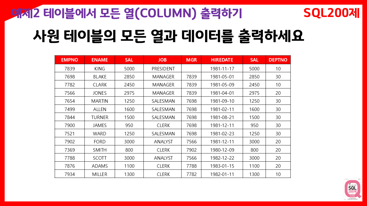 : asterisk 라고 함. 모든 컬럼을 다 선택하겠다는 뜻