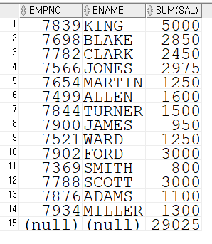 사원번호, 이름, 월급을 출력하는데 다음과 같이 맨 아래쪽에 전체 토탈월급을 출력하시오