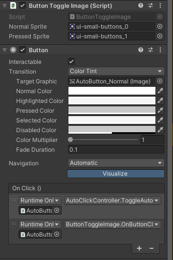 버튼을 만들고 Auto Click Controller스크립트를 컴포넌트 해주고 플레이어 컨트롤러 안에 플레이어를 넣어준후에 On Click에 버튼을 넣고 ToggleAuto를 넣어주면된다.
