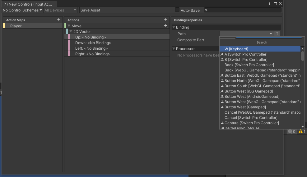 만약에 나는 WASD 설정을 말고 키보드 방향키로 하고싶다 하면 Up Arrow, Down Arrow, Left Arrow, Right Arrow 이렇게 찾아서 똑같이 설정을 해주면 된다.