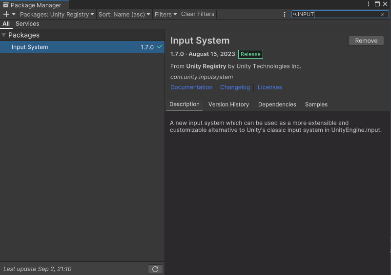 이렇게 Packages를 Unity Registry로 바꿔준후 input을 검색하면 바로 input system이 나온다.