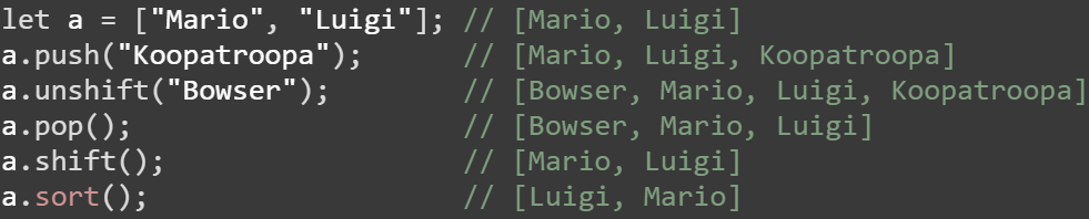 method: concat , join, pop, push, reverse, shift, slice, sort, splice, toString , unshift