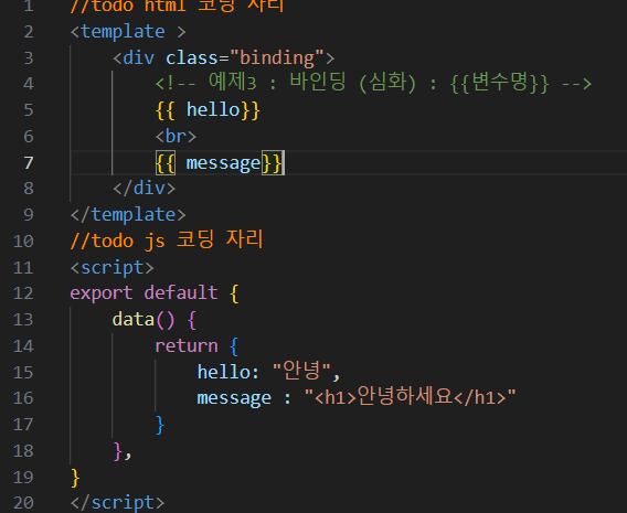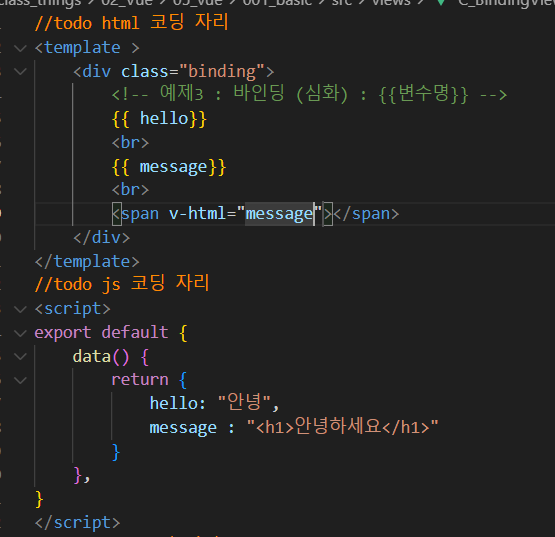 v-html이라는 속성을 이용하여 속성값에 message 속성을 주면된다. 그런데 이때 html태그(그림에서는 span)를 하나 만들어주어야한다.