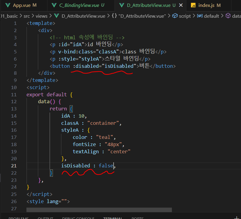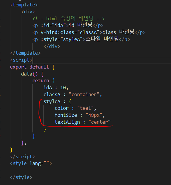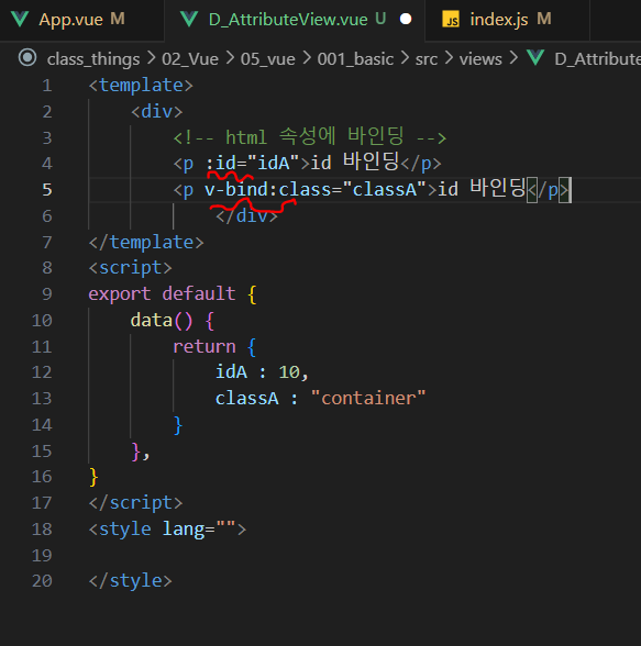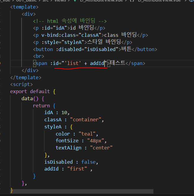 js에 속성을 준다음 이 속성을 html태그의 id와 class에 넣어보았다. 이때 제일 앞에 ":"을 넣어주어야한다. 이것은 v-bind:에서 v-bind가 생략된 것으로 둘 중 아무거나 사용하면된다.