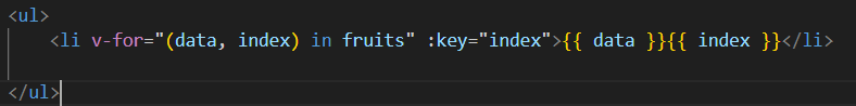 배열을 in뒤에 넣어준다. 영어로 해석해보면 배열 안의 data를 순서(index)대로 반복한다는 뜻이다. 그리고 출력할 자리에 {{data(배열의값)}}을 넣어주면된다.