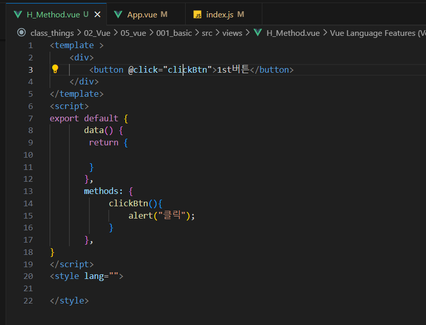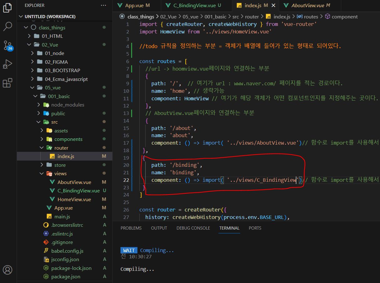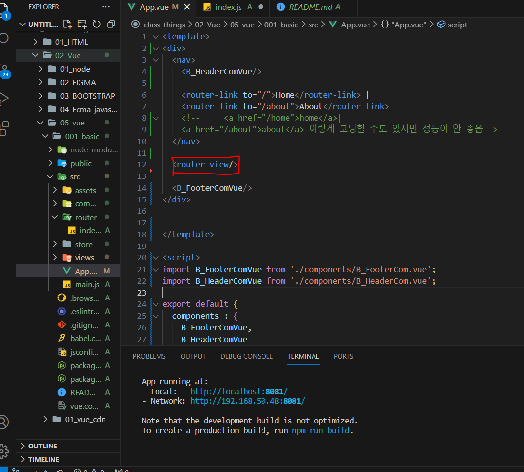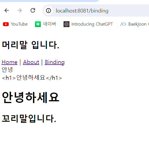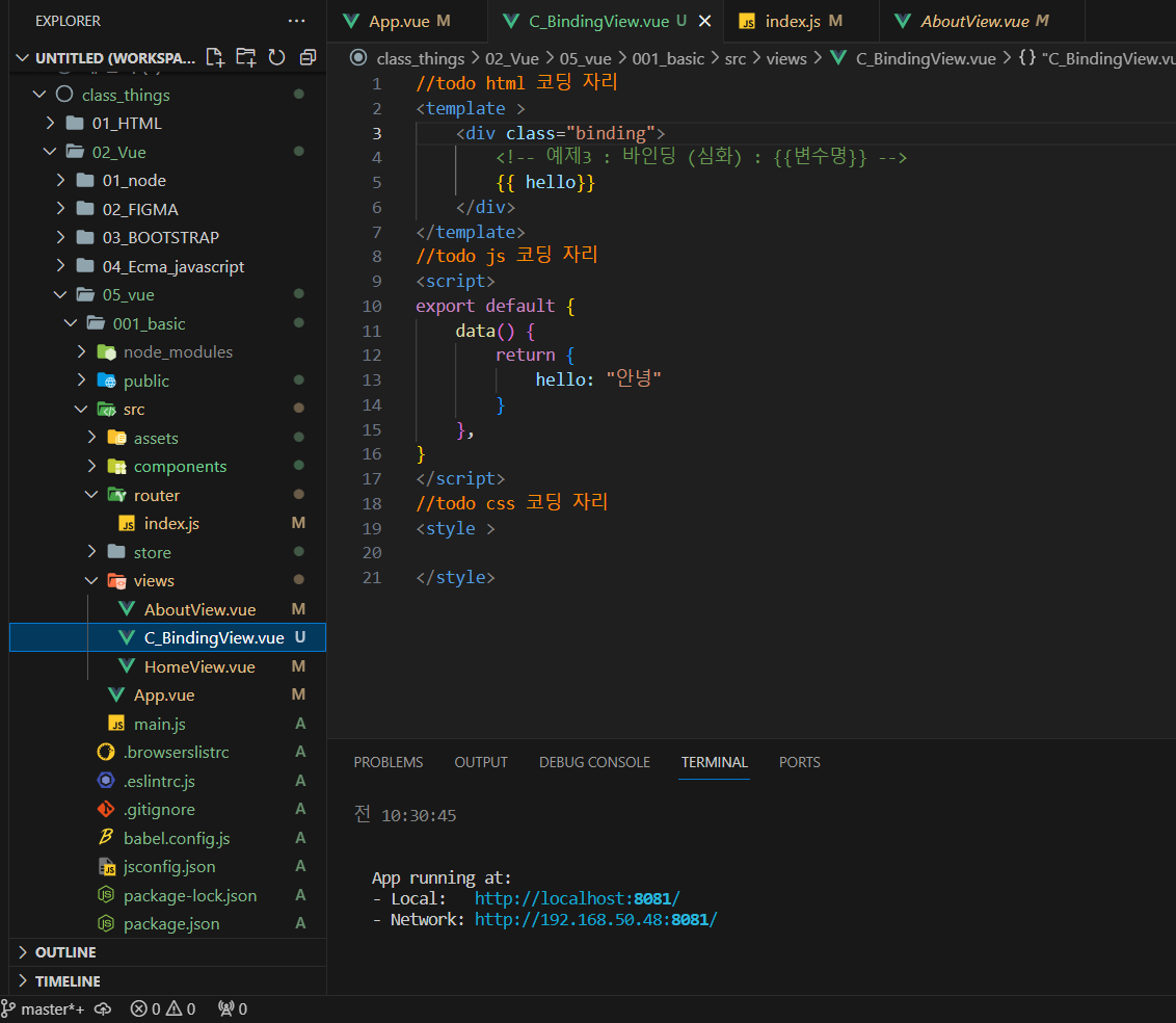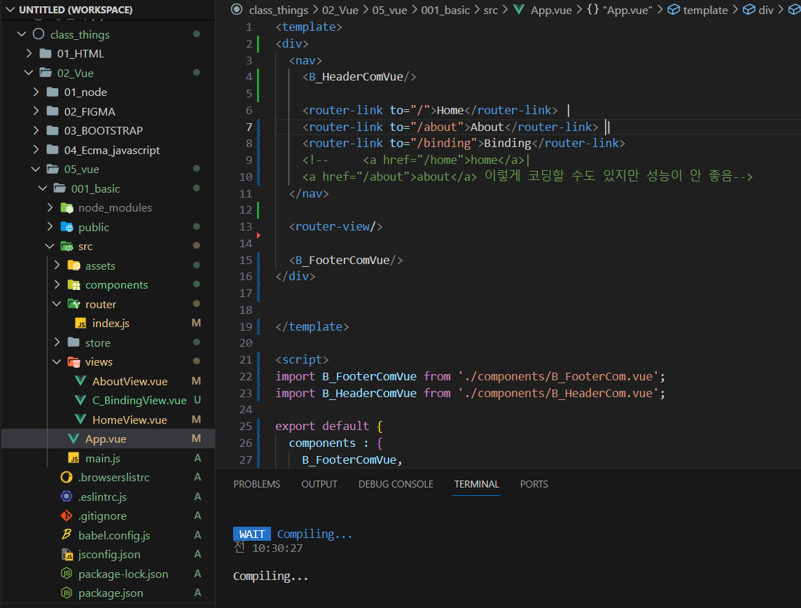 자주바뀌지 않는 거(머리말, 꼬리말)는 component파일에서 만들고 태그로 연결자주 바뀌는 것(본문)은 views에서 만들고 router-link로 연결하면된다. 그리고 태그에 js를 바인딩할때 모두다 똑같은 방법으로 바인딩을 하는 것이 아니라 함수, 조건문, 반복문, style... 다 각자의 방법이 있어서 이건 정리가 따로 필요할거 같다. 다음에 방법이 기억나지 않을때 블로그에서 쉽게 찾으면 좋을거 같다.