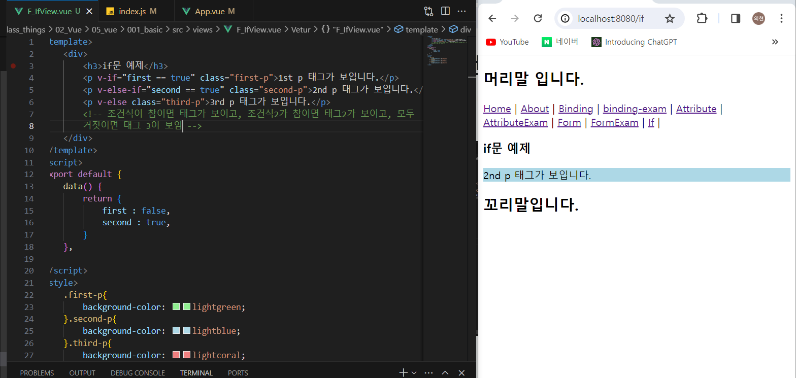 v-if로 조건을 주어 태그를 없애고 생기게 할 수 있다.first의 속성값은 false이므로 1st p태그가 사라졌고 second속성은 true이므로 두번째 태그는 보이고 두개 중 하나가 참이었으므로 세번째 태그는 보이지 않는다.