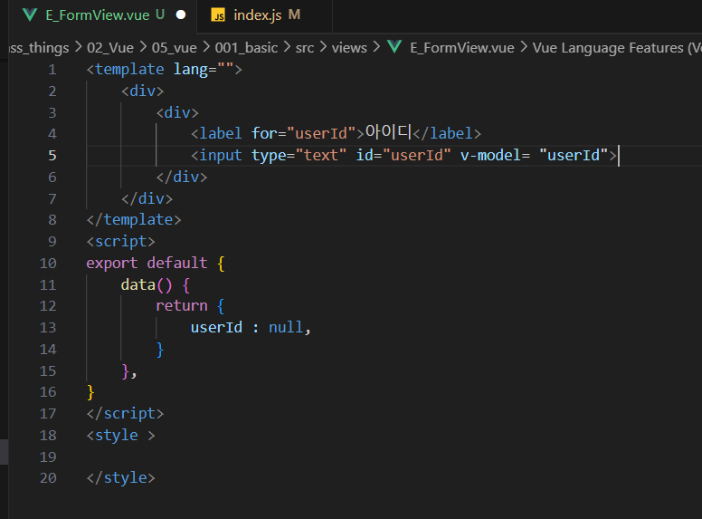 input태그를 js와 바인딩 하려면 다른 태그들과는 다르게 :이 아닌 v-model을 사용해주어야한다.