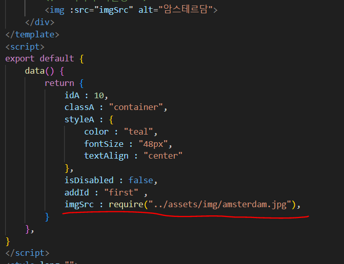 다 똑같은데 img를 바인딩하려면 그림과 같이 require함수를 사용해야하는 차이만 있다.
