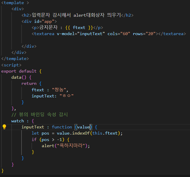 // TODO: 사용법 : watch:{ 바인딩속성: function(value){실행문}}