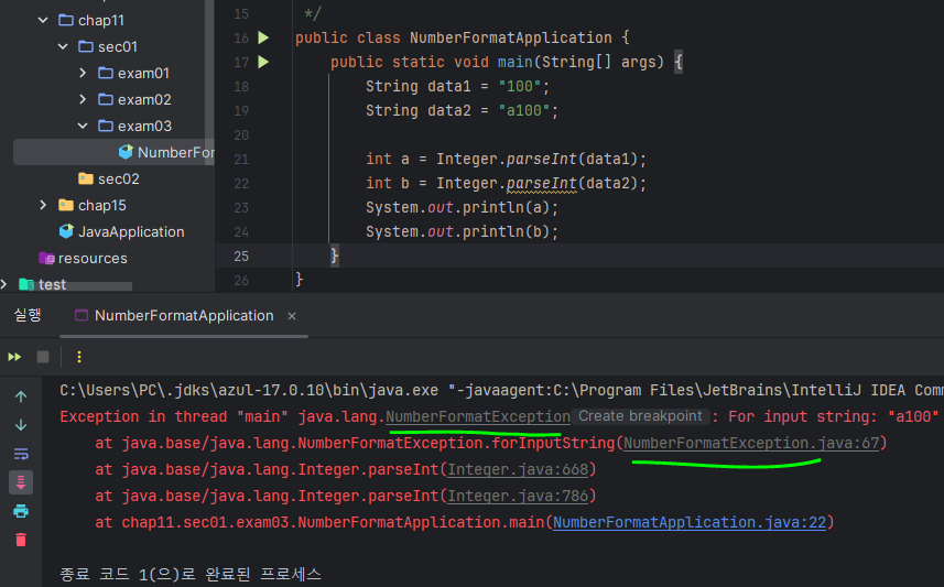 문자열이나 특정 값을 숫자로 변경하는 상황이 있다. 예를들어 "123"을 Integer.parseInt("123")숫자로 바꿀수 있다. 그런데 "asdf"는 숫자로 바꿀수 없는데 이것을 숫자로 바꾸려할 때 다음과 같은 에러가 발생할 수 있다.