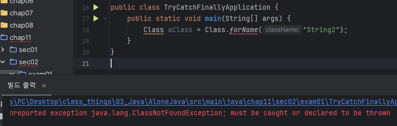 Class aClass = Class.forName("String2"); // 에러 발생