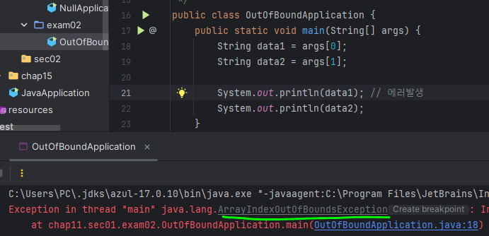 main함수는 args를 매개변수로 받는 함수인데, 아직 아무 값도 들어가지 않았다. 그런데 우리가 값을 호출했으므로 위와 같은 에러가 발생하는 것이다.