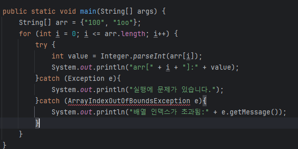 첫 번째 catch문이 실행되었다. try문에서 에러가 여러개가 발생하게 만들어 줬는데 첫 번째 문만 실행된 것을 볼 수 있다. 어차피 예외가 발생되면 바로 실행이 멈추기 때문에 try문에서 가장 처음 실행된 예외만 다루어 진다.