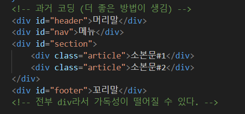 이건 예전 방식인데 div를 감싸서 id나 class에 정체성을 주는 방식이다.