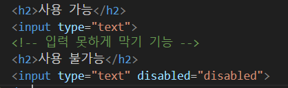 그림과 같이 속성에 넣어주면 된다. disabled는 사용을 못하게 막는 기능인데 여러 기능이 있으니 이것도 필요할때 찾아 쓰자.