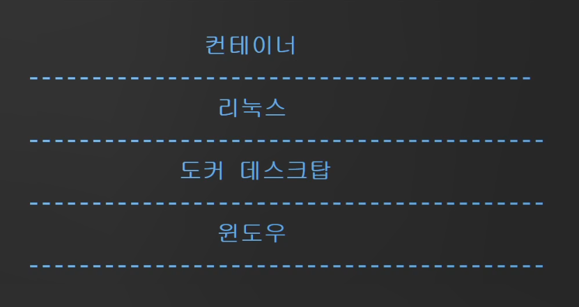 docker의 컨테이너는 os로 리눅스를 사용한다. 하지만 우리는 윈도우나 ios를 os로 많이 사용하는데 이때 리눅스를 사용하기 docker desk탑이 우리의 os에 가상공간을 만들어서 리눅스를 실행할 수 있는 os를 만든다음 거기서 컨테이너를 실행하는 것이다.