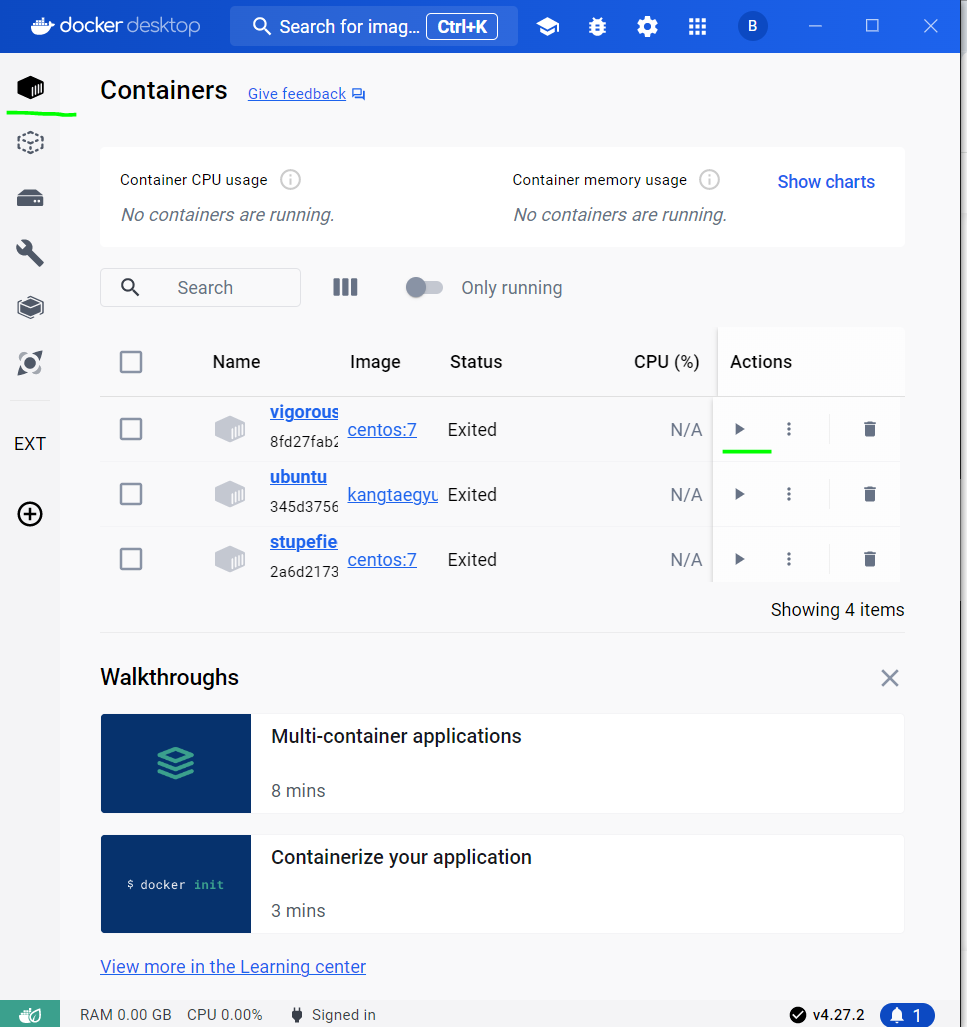 도커데스크탑 - container 탭 클릭 - action아이콘 클릭