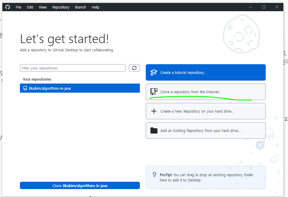 위 버튼을 눌러 GitHub에 있는 저장소를 pc에 Git으로 만들 수 있다.