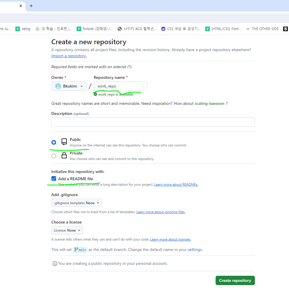 다음과 같은 화면이 뜨는데 해당 설명에 맞춰서 원하는 설정을 맞춰주면 되고, readme파일은 해당 repository를 설명하는 파일이다. 다 했으면 "Create repository"를 눌러주면된다.