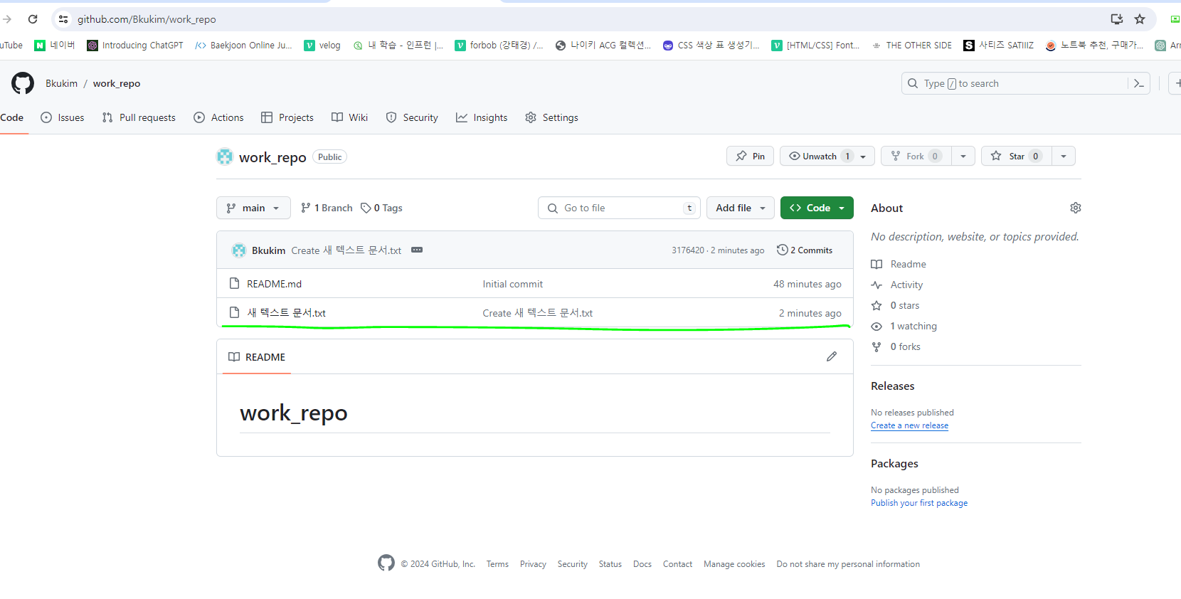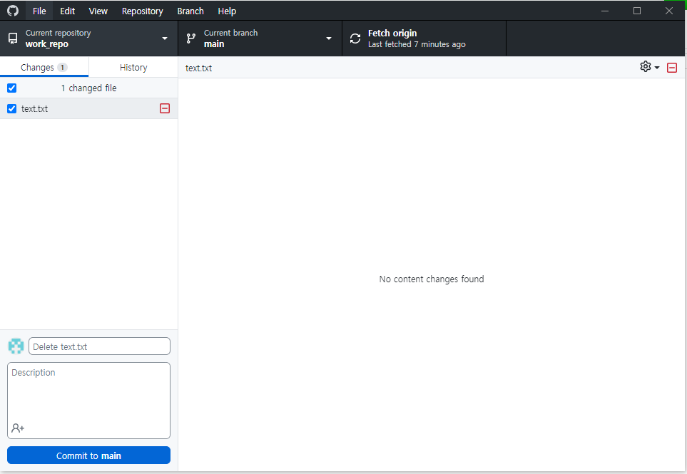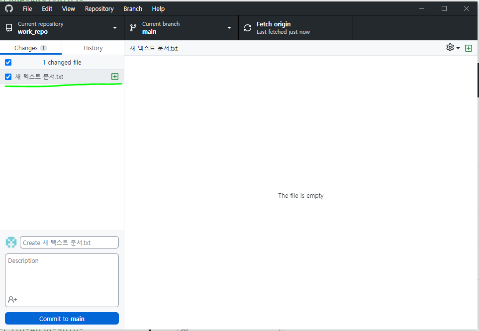 로컬저장소에 새로운 텍스트파일을 만들었더니 changed file에 새로운 파일이 생겼다.