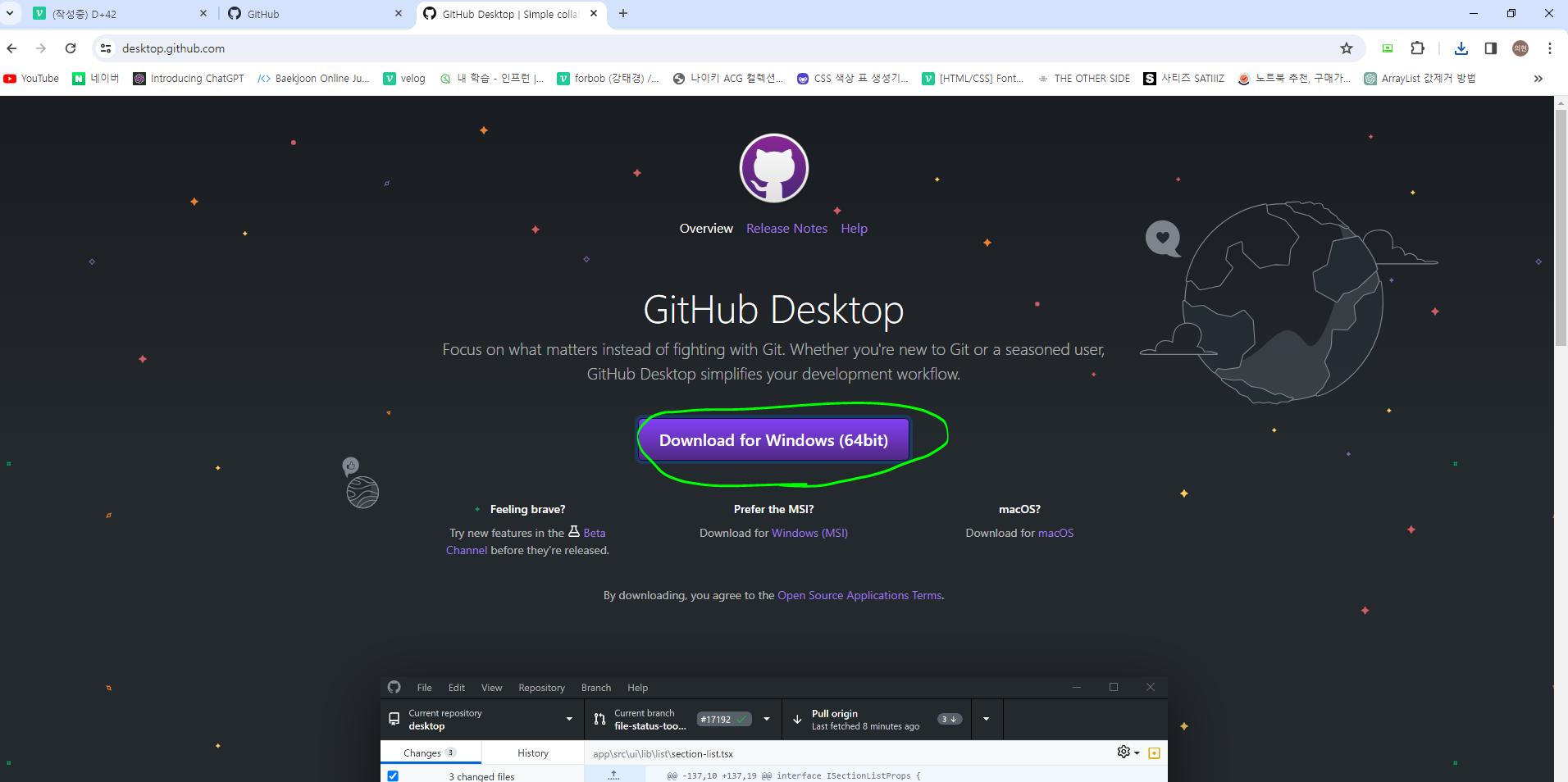 깃허브 데스크탑 사이트에 들어가서 위 버튼을 누르고 다운로드받으면된다.