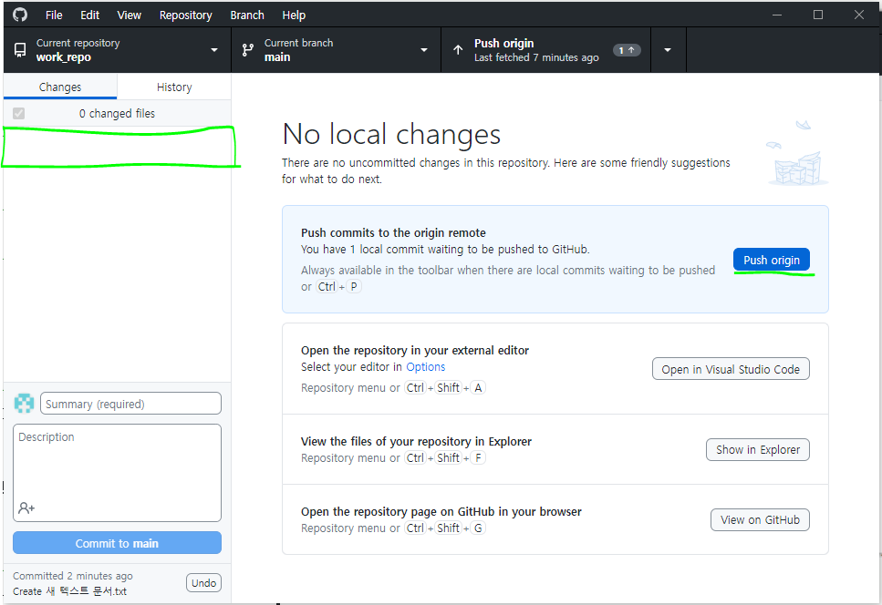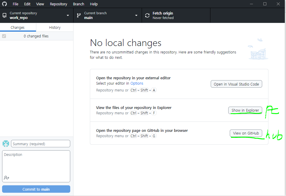 "show in explorer" 로칼저장소를 확인하는 버튼이고 "view on GitHub"는 깃허브를 확인하는 버튼이다.