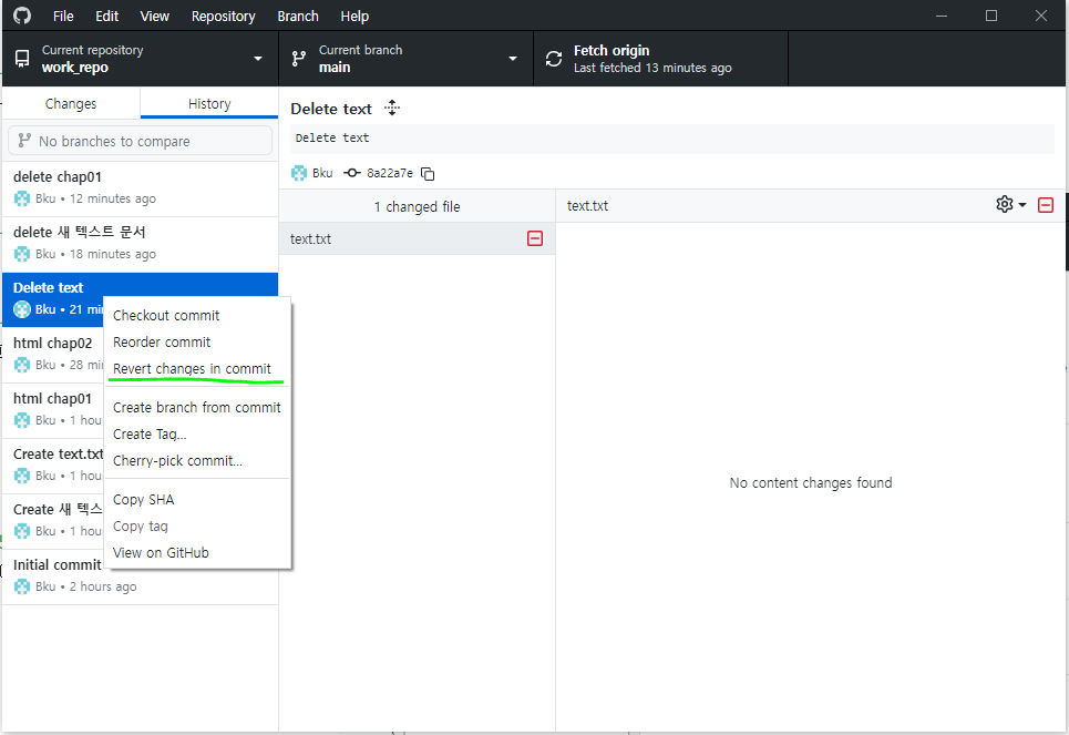 복구를 원하는 파일에 오른쪽클릭을해서 "Revert changes im commit"을 눌러주면 "Fetch origin"이 "Push origin"으로 바뀐다. 그걸 눌러주면 복구가 완료된다.