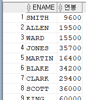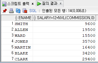 SELECT ENAME, SALARY * 12 + NVL(COMMISSION, 0) AS 연봉 FROM employee;