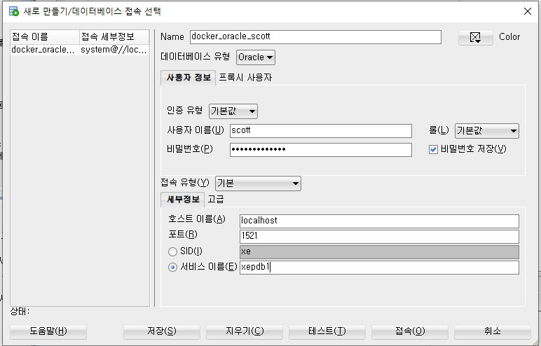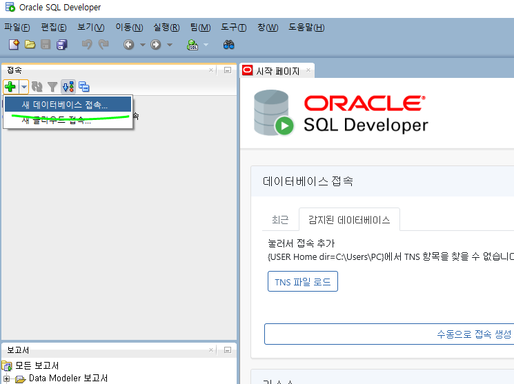 오라클에 들어가서 새 데이터베이스 접속을 눌러 데이터베이스에 오라클을 연결해 줄수 있다.