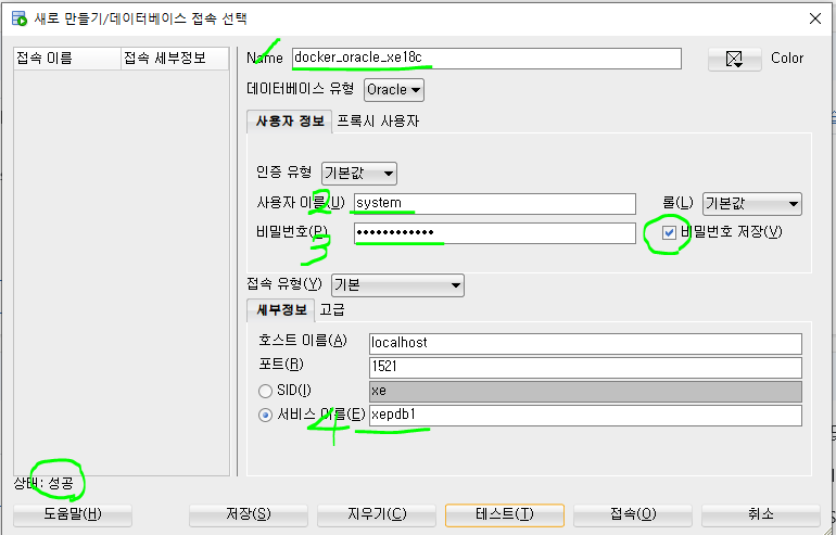 이 것들을 입력하고 테스트를 눌러 성공이 뜨면 연결 된 것이다. 이 컴퓨터가 가지는 ip(localhost)를 인식하여 이 컴퓨터에 있는 데이터베이스중 서비스 이름과 같은 데이터베이스를 찾아서 연결한다.