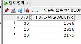 SELECT DNO, TRUNC(AVG(SALARY)) FROM EMPLOYEE