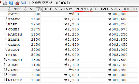 SELECT ENAME, SALARY, TO_CHAR(SALARY, 'L999,999'),