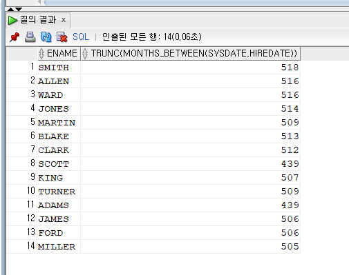 SELECT ENAME, TRUNC(MONTHS_BETWEEN(SYSDATE, HIREDATE))FROM EMPLOYEE;