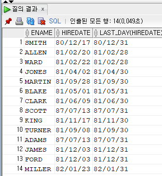 SELECT ENAME, HIREDATE, LAST_DAY(HIREDATE)FROM employee;