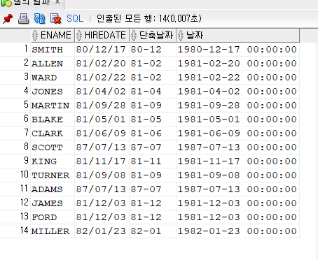 SELECT ENAME, HIREDATE, TO_CHAR(HIREDATE, 'YY-MM') AS 단축날짜,