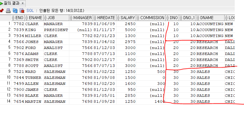 WHERE EMPLOYEE.DNO = DEPARTMENT.DNO -- 공통 컬럼이 있어야함. 대부분의 JOIN을 이렇게 함